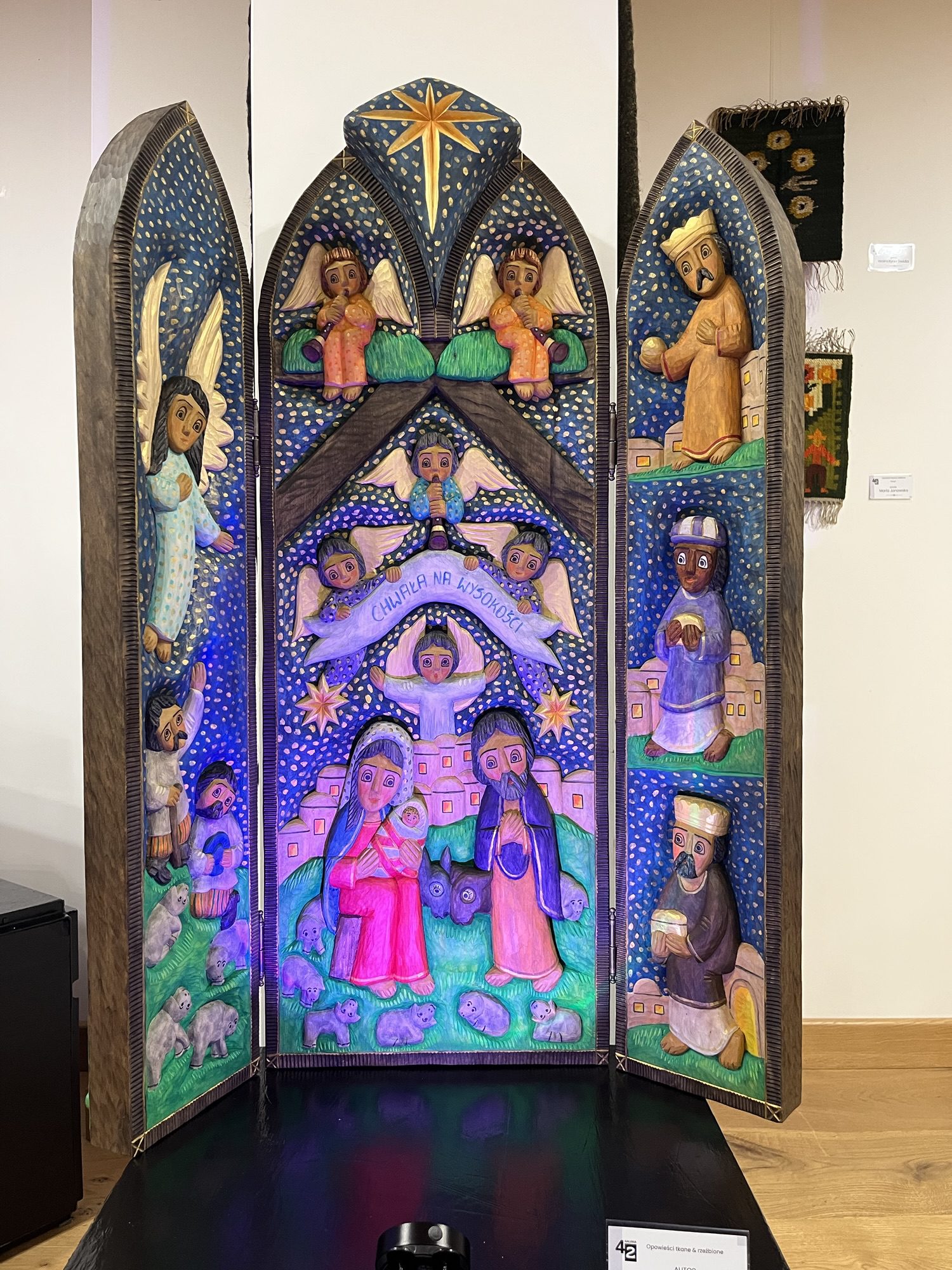 Kuratorką wystawy jest Marzena Stasiak, której pomysł i determinacja w realizacji projektu były wielokrotnie podkreślane w trakcie oficjalnych wystąpień. Jak zaznaczyła, intencją ekspozycji było stworzenie dialogu pomiędzy dwiema kolekcjami – tkanin artystycznych oraz rzeźby inspirowanej tradycją, religijnością i ludową wyobraźnią. Wspólna obecność tych dzieł buduje przestrzeń opowieści zapisanej w wełnie, drewnie i twórczym geście artystów.